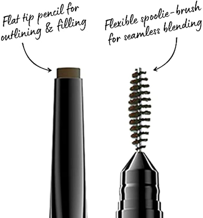 Dual Ended: This dual ended eyebrow pencil has a flat tip for outlining and filling in brows with detailed, hair like strokes; The other side features a flexible spoolie brush for seamless blending and combing out brows