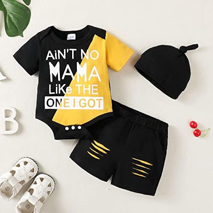 Package of Infant Boy Clothes: This baby boy clothes set includes one bodysuit, one short, one hat.