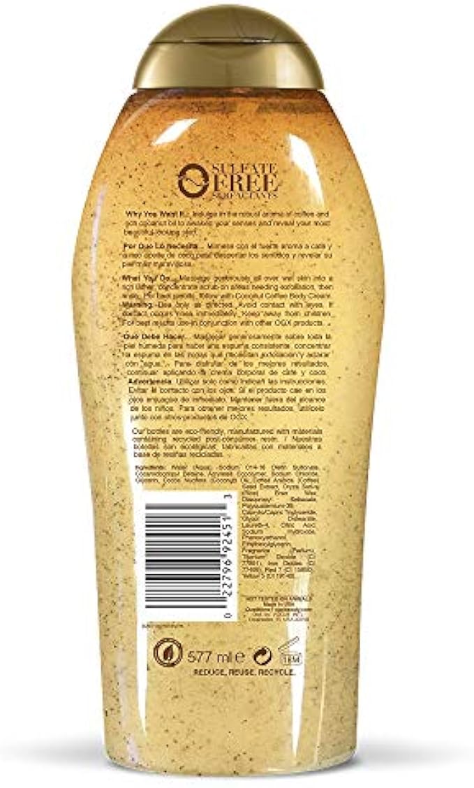 How To Use : Massage generously all over wet skin into a rich lather, concentrate scrub on areas needing exfoliation, then rinse. For best results, follow with Coconut Coffee Body Cream. Warning: Use only as directed. Avoid contact with eyes. If contact occurs rinse immediately. Keep away from children. For best results use in conjunction with other OGX products.