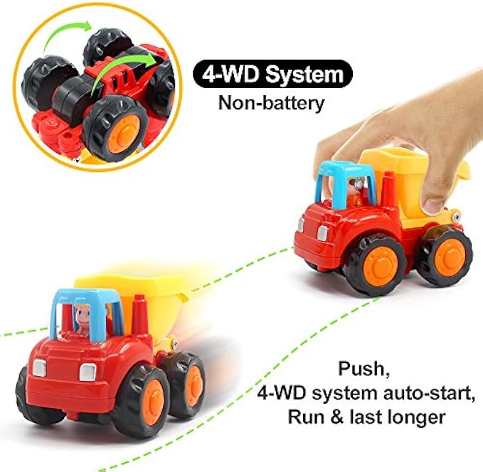 AWESOME FUN WITH 4-WD SYSTEM -- Push friction powered toys slightly, it'll go last for long distance. Children enjoy with happy engineering vehicles in playroom, sandbox and everywhere, transport of construction sites carrying sand and other materials.