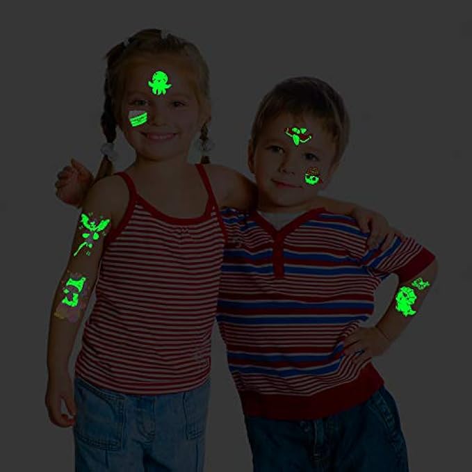 【380 Mixed Styles Temporary Tattoos for Kids】Luminous mixed styles temporary tattoos for kids. Even at a party with lots of friends, these glow tattoos will make you unique in the crowd! These super fun elements of our fake tattoos include unicorn, dinosaur, mermaid, shark, space, fairy, pirate, jungle animal, robot, butterfly, circus, ice-cream, dogs, cats, and other cute patterns that kids will like. A set of mixed style tattoos can meet the whole kids party need! 【Simple to Use and Remove】Choose the pattern you like, and then face down on skin, wet the temp tattoo with water and wait for 10 seconds. TIPS: Luminous tattoos need to be activated under light for a few minutes, which can make them more luminous in the dark. Sensitive skin, please use with caution. If you feel unwell, please stop using immediately. 【Quantity and Quality】Package contain 30 sheets (380 PCS) luminous tattoos for kids and suitable for boys and girls, this means that every kid at the party can get a luminous and cute tattoo. Each sheet measures 4.7 " x 2.9 ". Our temp tattoos undergo rigorous party testing, we guaranteed the fake tattoos will last all day. 【Applicable Place】These tattoos stickers are perfect for kids birthday party supplies, party favors, party decorations, Easter basket stuffers, kids light up toys, etc. You can apply them to your body or some smooth objects, such as glass, tile, water bottle, plastic, phone case and so on. Are you looking for the perfect glowing party accessories? Our glow temporary tattoo is your good choice, which will add the fun of parties. There are many other super cute temporary tattoos for kids in our store. We also have Luminous series and Metallic Glitter series. Different theme include unicorn, circus, construction theme, dinosaur, luminous space theme, etc. If you need other party supplies, please click Partywind to enter the store to get more fun!