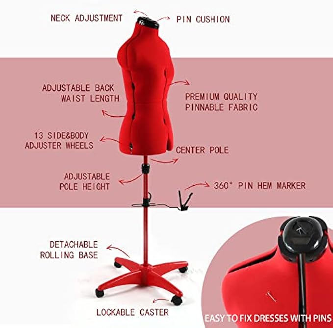 Multipurpose Dress Form: This professional mannequin torso is perfect for your sewing work. You can use it to display your work at home, in your office or shop. It is stable enough to hang heavyweight clothes and decorative materials on it. Rolling base allows you to move it easily, and the caster is also lockable for stationary usage