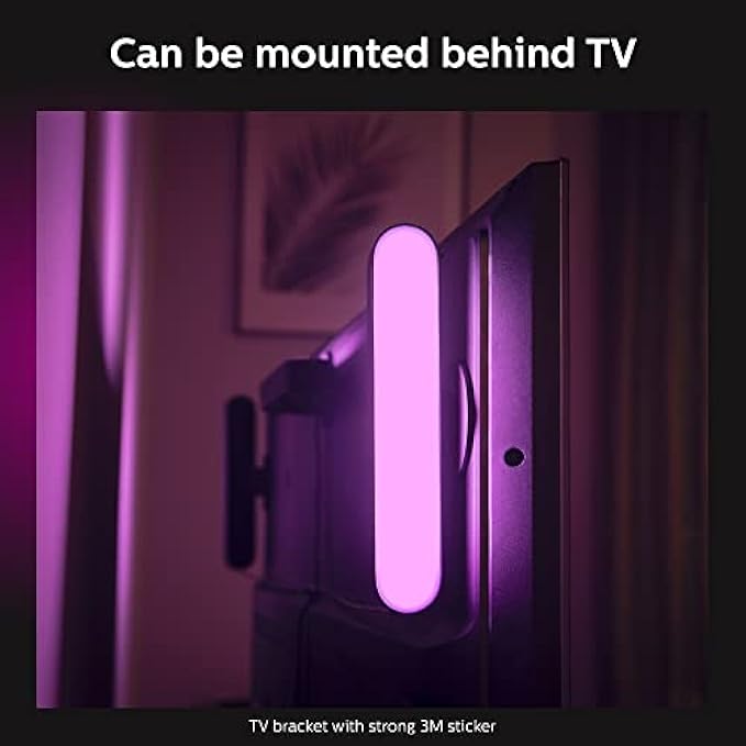 The Ultimate TV Lighting Experience: Create the most beautiful backlight for your TV Simply mount the Philips Hue Play behind your screen using the clip and double-sided adhesive included in the package, and enhance your viewing experience with flashes of light on your TV.