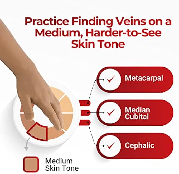 CHALLENGE YOURSELF TO FIND HARD-TO-SEE VEINS — With our IV start kit, you can learn how to identify and access veins that are difficult to see, especially on darker skin pigmentation. Instead of relying on visual cues, you'll learn to feel for the veins.
