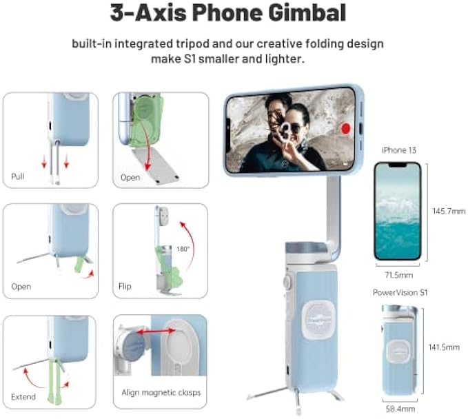 【Professional-Grade Stabilization】: Get smooth, steady footage every time with the PowerVision Smartphone Gimbal Stabilizer's 3-axis anti-shake technology and built-in tripod, designed for professional-quality videos and photos.