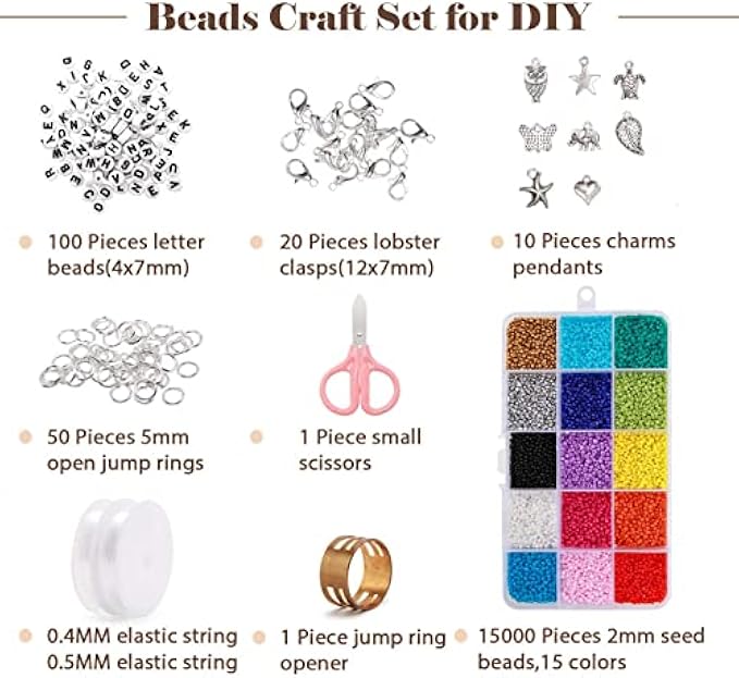 15 Colors Seed Beads Set with Pendants: Comes with 15000pcs high quality craft glass beads in 15 colors, 2mm in diameter, lightweight and strong. Contains 100 alphabet beads and pendants in different styles, elephants, butterflies, starfish, turtles, owls, leaves, stars and love patterns. Enough quantity, can make many lovely and exquisite glass bead jewelry