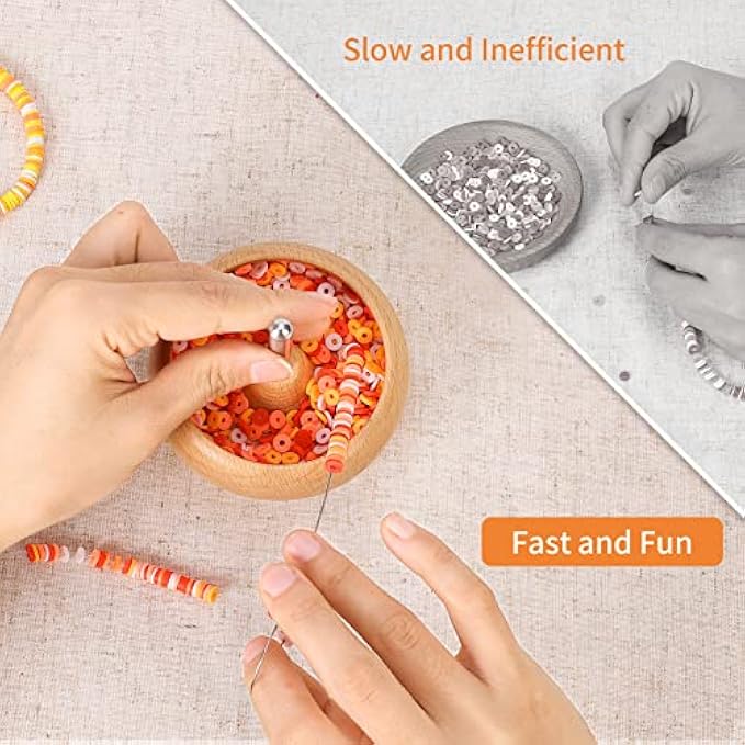Fast Clay Bead Spinner: The wooden bead spinner is 3.5H x 9W with a smooth surface and a stainless steel shaft that spins smoothly and makes no noise while spinning. With this bead spinner, you can string beads faster and save more time and energy