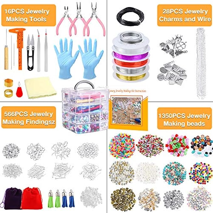 All-in-One Jewelry Making Kit: Contains 16 pieces of jewelry making tools, 28 pieces of jewelry making ornaments, 566 pieces of jewelry making accessories, 1350 pieces of jewelry making beads. Includes the jewelry finders and tools you need for jewelry, necklaces, bracelets, earrings making and repairing.