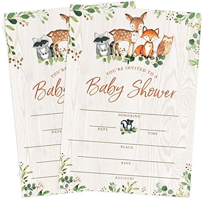 Printed Party Baby Shower Invitations and Envelopes, Woodland Animals, Set of 25