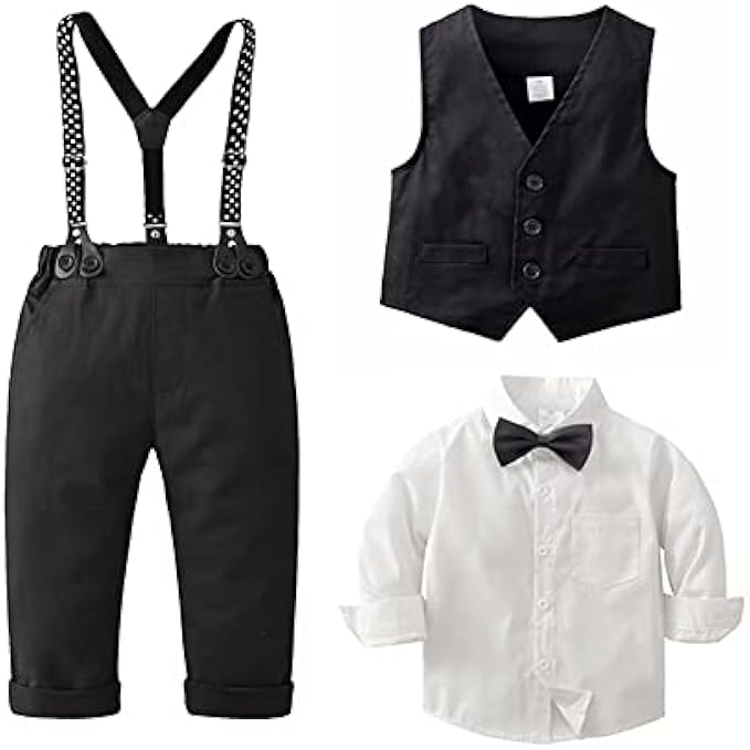 • Stylish Boys Vest Suits Set: pants are designed with elastic waistband, easy to put on and take off, detachable suspenders and bowtie.