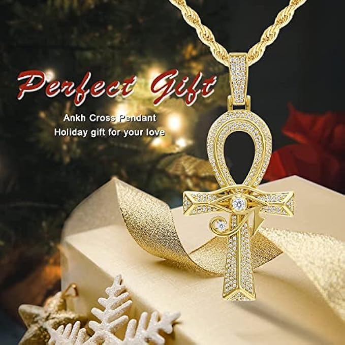 ?MATERIAL& SIZE — High quality stainless steel rope chain with iced out 14k gold/white gold plated bling ankh cross over fine brass pendant. Rope chain length: 24inch, chain width: 2.5mm; Pendant size: 62*28mm.