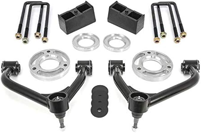 • CNC-machined billet aluminum top spacer and pre-load spacer kit. with heavy-duty control arms, 1-ton ball joints and maintenance-free pivot bushings.