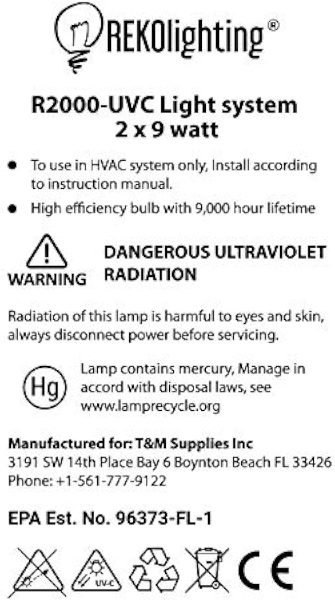 REKO Lighting R2000 Air Purifier Whole House Uv uvc Lamp Tube for HVAC (Air Conditioning) Duct