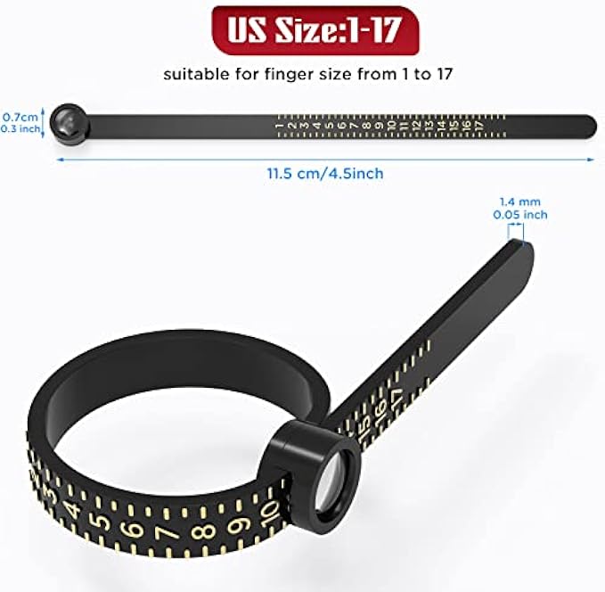 【Easy to Use】This ring size measuring tool is very convenient to use. Simply thread the ends through the clasp to create a loop shape. Then slip it over your finger and adjust for a snug fit. Just read the size through the magnifying glass.