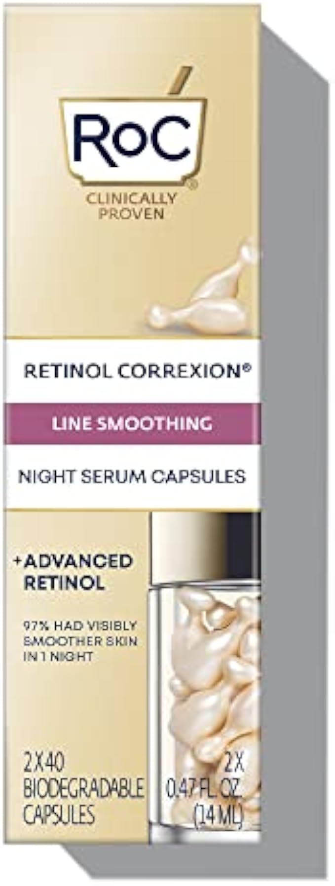 OVERNIGHT RETINOL TREATMENT: Improve the look of collagen-depleted skin with this encapsulated night serum, sealed tight for optimal freshness. Powered by concentrated pure RoC Retinol & a bio-derived antioxidant with 2X the effectiveness of Vitamin E.