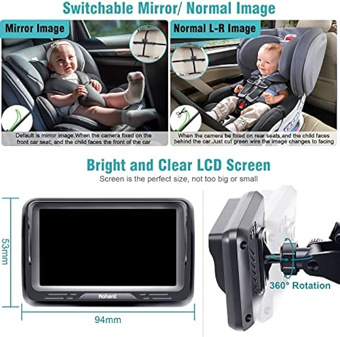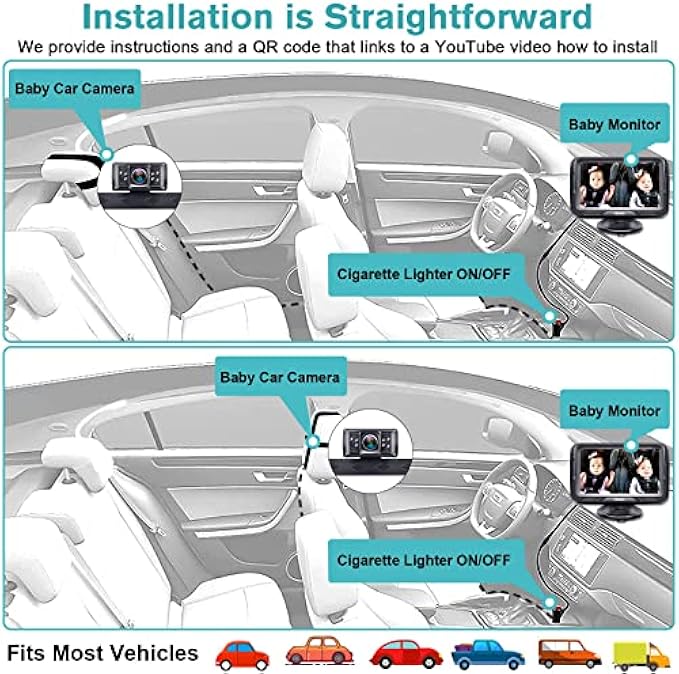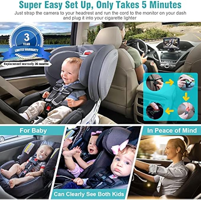 Clear HD 1080P Picture Quality and Night Vision automatically turns on. 940nm IR LEDs. Baby camera for car with wide view angle can see two kids in the back seat at the same time, brings such peace of mind to you while driving.