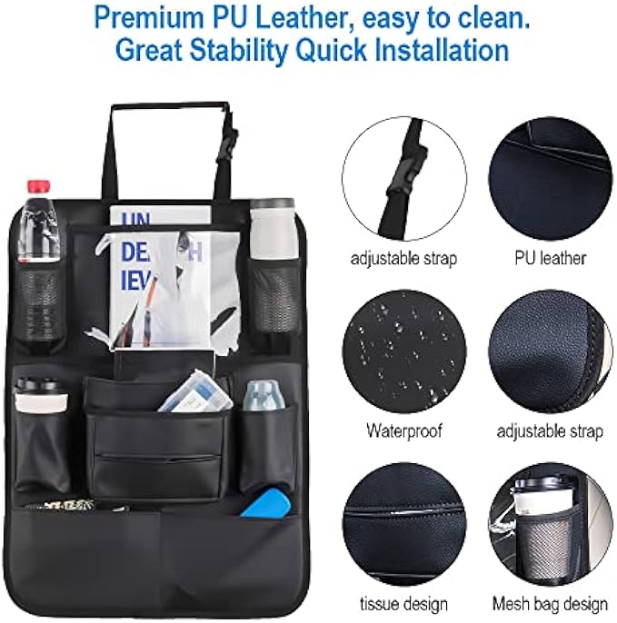 ★WATERPROOF PU LEATHER MATERIAL: Soft PU leather which is easy to clean and water-resistant!car seat organizer is made of high quality PU Leather with perfect waterproof property and good durability. Making your car looks very luxurious! Besides, it protects the back of your car seat from dust, abrasion and kicking dirt Ideal for those with kids and pets as well! Minimize damage from footweare damage from footwear