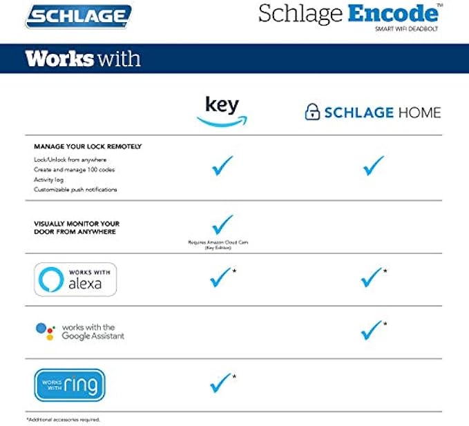 Smart Lock with Built-in WiFi allows you to lock/unlock from anywhere - no additional accessories required. Pair with the Schlage Home app or Key by Amazon app to create and manage up to 100 access codes for trusted friends and family for recurring, temporary or permanent access.Note: Measure your door's backset, cross bore and thickness to ensure you find the right fit.Note: Measure your door's backset, cross bore and thickness to ensure you find the right fit.