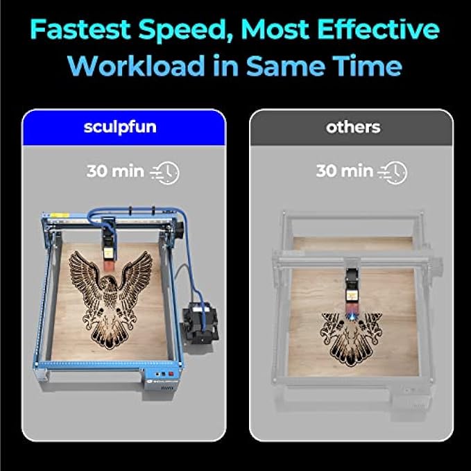【Automatic Control Air Assist System】SCULPFUN S30 series is equipped with air assist 32-bit main board and automatic air assist pump, which can intelligently control the laser engraving machine, turn off the air assist during engraving and turn on during cutting to avoid engraving Pattern is destroyed. Manual control wastes time and leads to poor engraving due to forgetting.