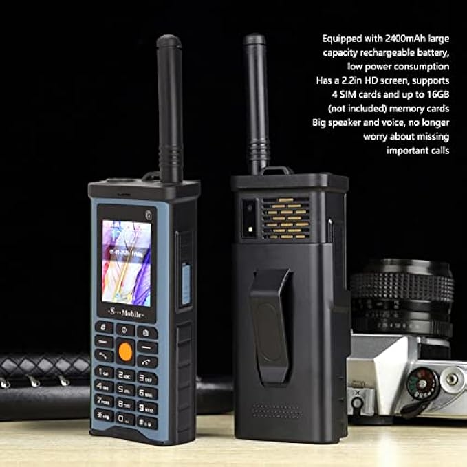 POWERFUL TOOL: This Cell Phone with Big speaker and voice, no longer worry about missing important calls. Excellent sound and video playback multimedia capabilities. Support MP3 playback function, support video playback, support recorder, FM and so on. The phone is also ideal for seniors or as a backup phone for younger people. EASY TO USE: This Cell Phone With a 2.2-inch HD screen, it supports 4 SIM cards and up to 16GB (not included) memory cards. The phone is a 2G phone with supported network bands: GSM 800/850/900/1800, clear keys and numbers for easy dialing, and a powerful speaker that ensures every call is clear. MULTI FUNCTIONS: This Cell Phone Support various functions, including phone book, camera, radio, alarm clock, recording, calendar, flashlight, calculator, Ebook, strong vibration reminder, world clock, Ebook, unit conversion, tasks, notepad, etc. 3.5mm headphone jack, easy to use headphones. Supported social software browsers. SPECIALLY DESIGNED: Removable antenna rod, can be stretched to enhance the signal, in the outdoor or poor signal can be stretched to enhance the signal. It comes with an extra stand for easily attaching the phone to the belt, making it more portable. Strong light flashlight, flashlight button, just click it, you can see better in the dark. The rugged case design makes the phone durable. LARGE BATTERY CAPACITY: This Retro phones are equipped with 2400mAh large capacity rechargeable battery, low power consumption, long standby time, avoid frequent charging. The phone is easy to charge, using a charging cable to charge. Also has power bank function with an extra USB port to charge other electronic devices, which is useful in emergency situations.
