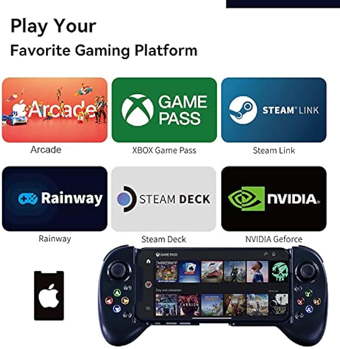 Compatible with Xbox Game Pass Ultimate, Steam Link, GeForce NOW; Apple Arcade and MFi games & hundreds of popular mobile games including Fortnite, Minecraft, Genshin Impact, Brawlhalla, Asphalt 9: Legends, Cyberpunk 2077, Destiny 2, Gear, Halo 5, Apex, Collection, emulators & many more.