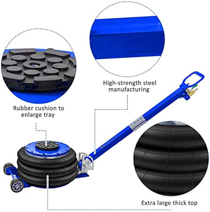 【PRODUCT ATTRIBUTES】Pneumatic Jack, capacity:6600LBS, height range: 6.5-16 inches, working pressure: 145Psi / 10Bar / 1.0Mpa, air inlet: G1/4, lifting time: 5 seconds, working temperature: -60 ℃~50℃,color: blue.
