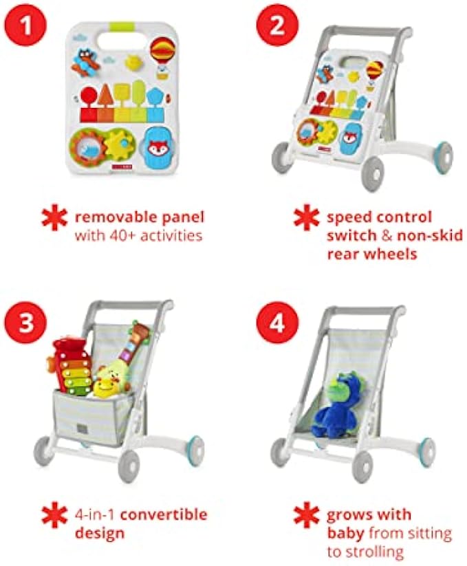 Packed with 40-plus play features, songs, sounds, lights and more, our convertible activity walker helps little ones learn and grow with four engaging ways to play: seated, cruising, shopping cart and stroller