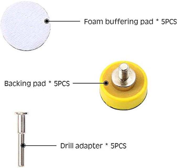 【WHAT YOU GET】 5 x Foam buffering pad, 5 x Backing pad 1 inches (24.7mm), 5 x Drill adapter.