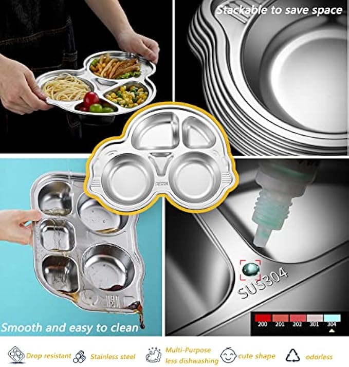 Stainless Steel Plate Divided Meal Tray Sections Dinner Dish for Babies, Toddlers and Kids Eating Food Car Shape BPA-Free Safe Fun Non-Toxic Heavy Duty (silver 2 pack)