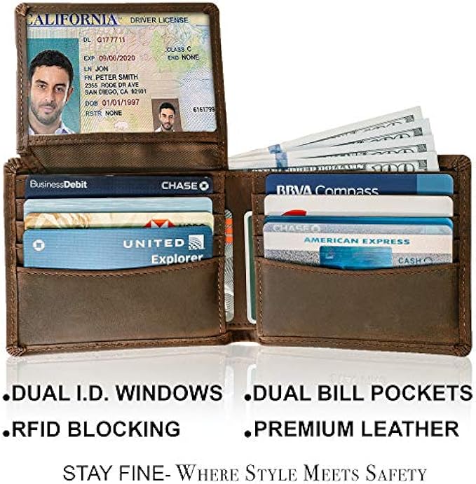 STAY FINE Top Grain Leather Wallet for Men | RFID Blocking | Extra Capacity Bifold Wallet with 2 ID Windows | Ultra Strong Stitching | Slim Billfold with 8 Card Slots | Gift for Him