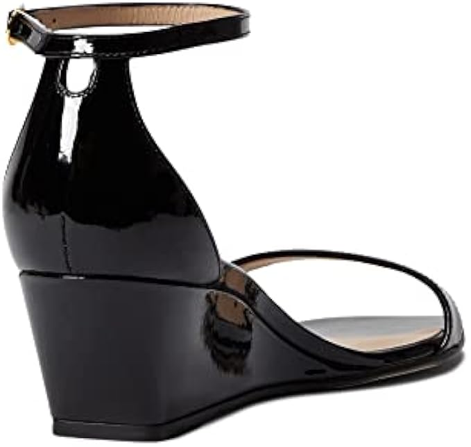 SLEEK DESIGN: Add a sleek and modern touch to everyday attire wearing the Stuart Weitzman Nudistcurve 50 Wedge, featuring a flattering open square toe with thin strap, a patent leather upper, and a stylish wedge heel