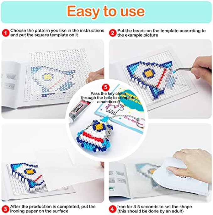 【Safe Material】The molten beads are made of high-quality materials, which are safe, non-toxic and durable, ensuring that your creations will last for a long time. The beads are easy to use - just line them up on the board and after placing the iron-on paper on the craft, check the beads under the paper to make sure the beads won't move. Using light, even pressure, push the iron onto the ironing paper with the beads on it until they fuse together to successfully create your creation.