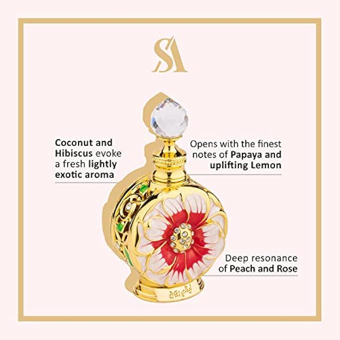 LAYALI ROUGE: YOUR NEW SIGNATURE SCENT. Opens with finest notes of Papaya and uplifting Lemon. The beating heart of the fragrance brings out the deep resonance of Peach and Rose. Coconut and Hibiscus add depth to the aroma and inspire attention.