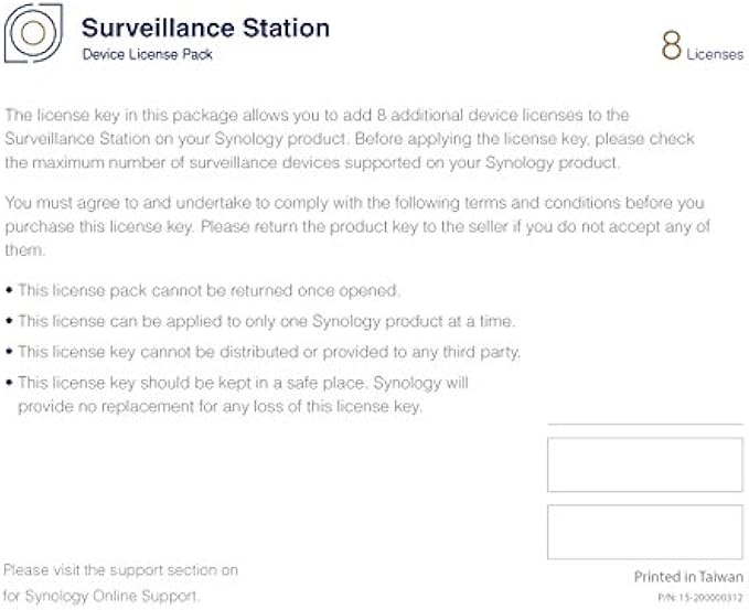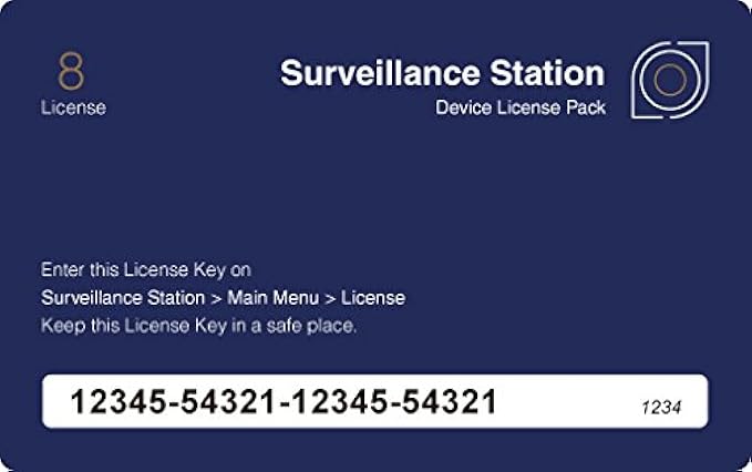 Synology also offers three options for additional license purchases: 1, 4, or 8 surveillance device license packs; each comes with a license key that lets you activate 1, 4, or 8 surveillance devices at a time.