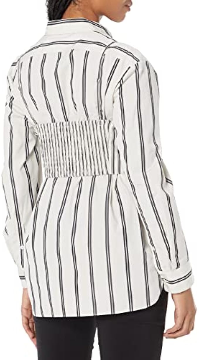 • Removable cami overlay with boned sides, smocked elastic back, adjustable straps, Collared neck and button placket, Long sleeves with button cuffs, Stripe pattern, Curved hem