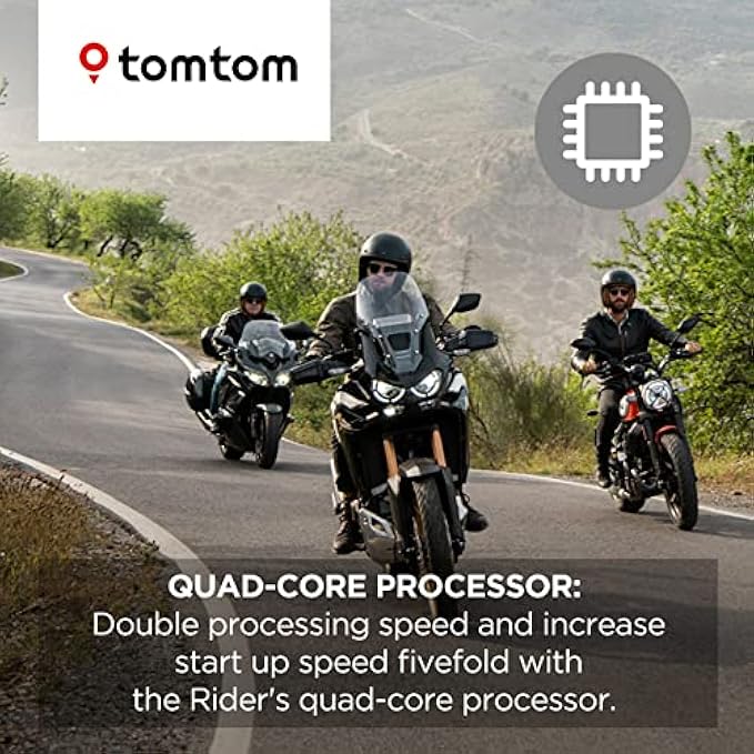 Quad-core processor: The TomTom rider GPS’s quad-core processor runs commands simultaneously, doubling your overall processing speed and increasing your GPS's start up speed fivefold