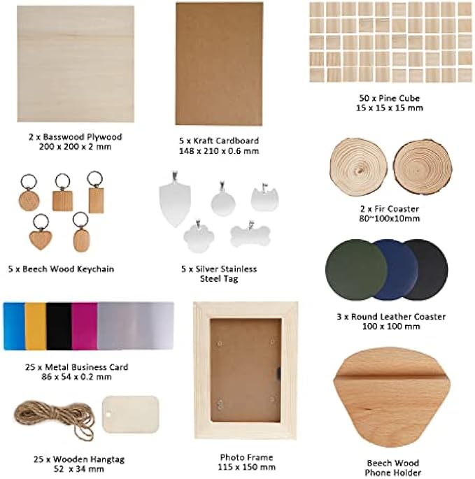 Twotrees Laser Engraving Material Box Set, 124 Pieces DIY Materials for Laser Engraver with Metal Business Cards Wooden Cube Plywood Dog Tag Frame Keychain Listing Leather Coasters