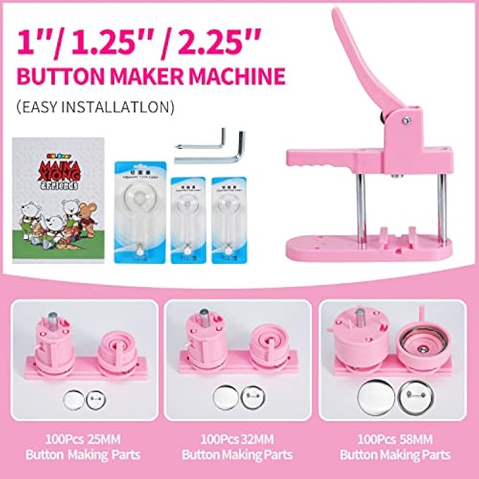 ⭐New Upgrade Pin Maker-3rd Gen: PINK button maker DIY 25mma& 32mm &58mm badge making machine adopt high strength engineering plastics, Install the button maker machine with the button adapter you need, prepare all button making supplies: pin cover, picture, plastic film, pin backs. Then make buttons according to the steps of instruction. It is very easy for no matter beginners, kids or elders.