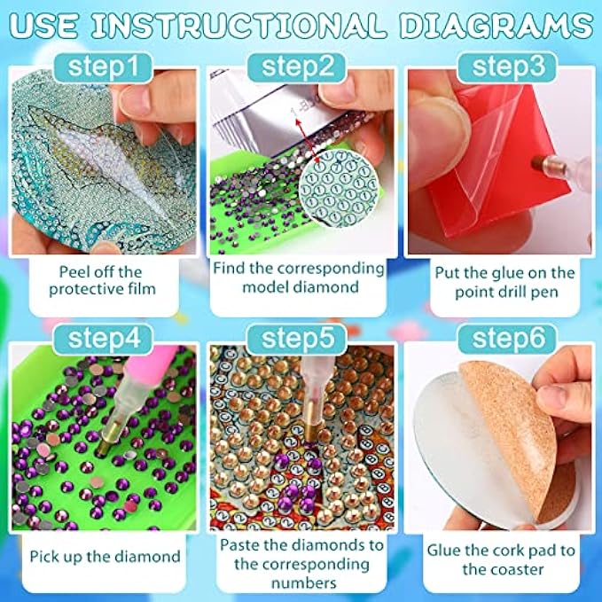 【Easy to Use】Our DIY diamond painting kit comes with drawing tools to help you make it. The production process is as follows. First, tear off the coaster film, and then pick the diamonds you need according to the number of coasters. Finally, glue the diamonds to the cup holders.
