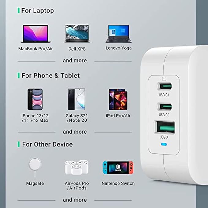 ✅100W PD 3.0 Wall Charger for High-Speed Charging: Our 100W PD charger from single usb c port charge your MacBook Pro 15.4” from 0% to 100% in only 1.5 hours
