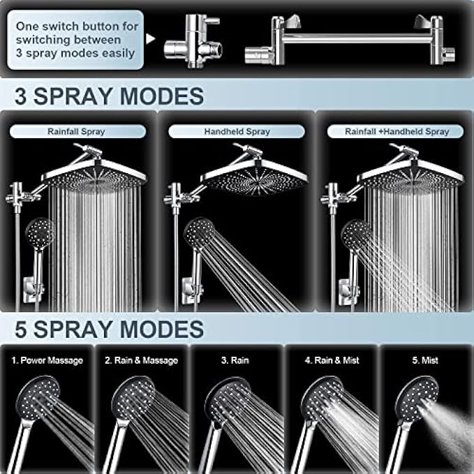 Veken 12" Rain Shower Head, 5 Settings High Pressure Handheld Spray, Shower Head with Adjustable Extension Arm, Chrome Dual Shower Head and Hand Shower Combo with 70" Soft Tube.