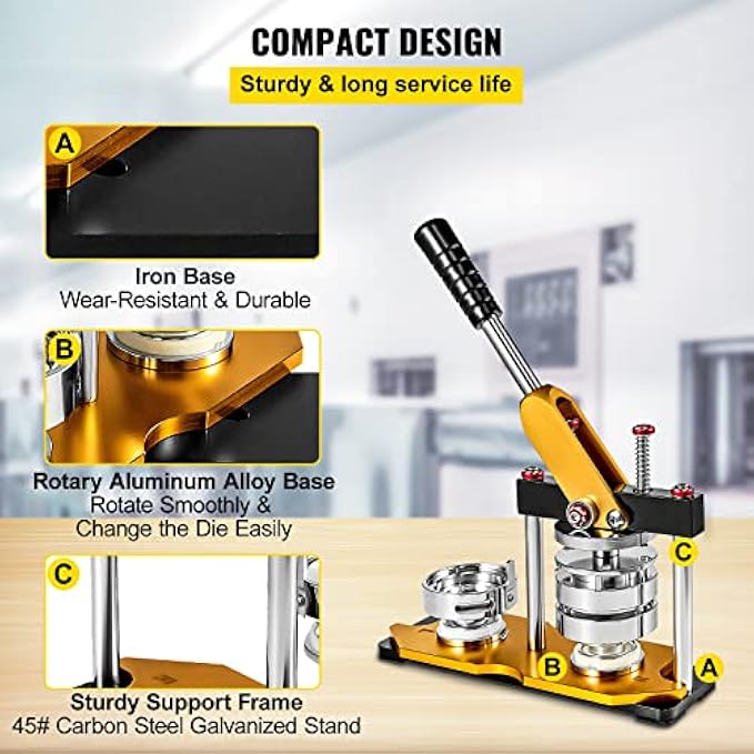Button badge maker material: cast iron and injection; Solid die-casting aluminium frame work; Steel handle and reliable mould base