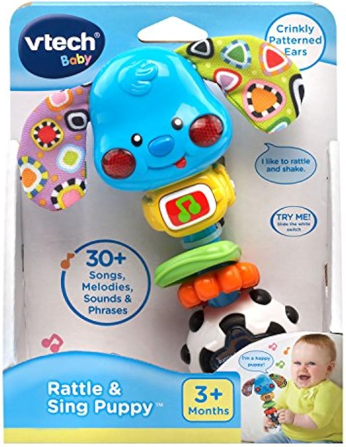 Shake the easy-to-grasp rattle and sing puppy to hear the colorful beads rattle