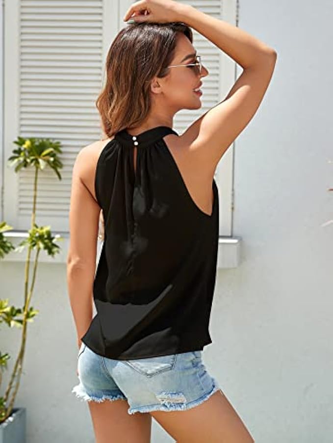 CHARACTERISTIC-- Basic Summer Halter Blouses ; Pleated Mock Neck & Keyhole Pearl button back closure; Perfect Length to be tucked in or wear it loose; Relaxed fit & Comfortable; Looks classy to wear alone or as layering.