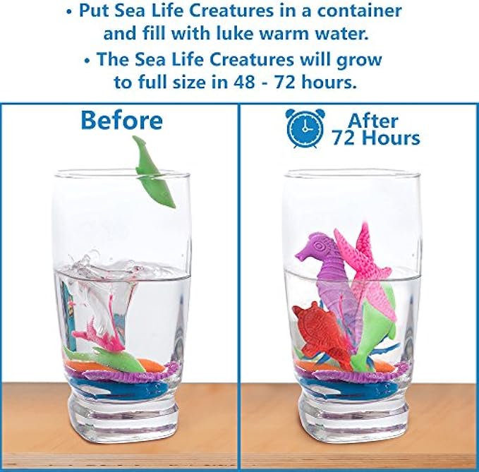 ADD WATER AND STAND BACK! – These 2’’ sea creatures expand in size up to 300% when they are in water, almost like magic! Let your child play with these gigantic creatures while giving them their daily bath or while playing outside in the pool or fountain! You can grow an underwater zoo or make an aquarium in a glass or bowl. The possibilities are endless!