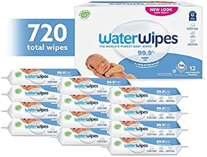 WaterWipes Plastic-Free Original Baby Wipes, 99.9% Water Based Wipes, Unscented & Hypoallergenic for Sensitive Skin, 720 Count (Pack of 12), Packaging May Vary