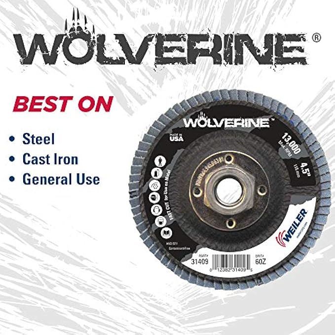 Weiler 31409 Wolverine 4-1/2" x 5/8"-11 UNC NUT Abrasive Flap Disc, 60 Grit Zirconia Alumina, Flat Type 27, Phenolic Backing, Standard Density, Made in The USA, (Pack of 10)