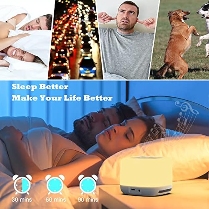 【40 Soothing Sleep Sounds】This white noise machine has 12 lullaby sounds and chewing sounds to entice baby's sleep and appetite; 7 white noises and 7 fan noises; 9 nature sounds include thunder sounds, ocean sounds, rain sounds etc.;5 meditation sounds and yoga sounds to provide the most relaxing experience and help you fall asleep. 【Timer & Memory Function】This sleep sound machine can be used for travel, sleep, Yoga, meditation, relaxation, work, and more; The timer features 3 options: 30, 60, or 90 minutes; The white noise machine has a memory function that remembers your last settings. 【Color light & Night Light】This white noise machine has adjustable, soft LED night light, which provides ample but not harsh light in your bedroom at midnight. The sound machine has 7 colors or automatically changing color lights, perfect as a bedside lamp, baby care light, relaxation light, romantic mood light, etc. 【Small Portable & Rechargeable Battery】This sleep sound machine is small and lightweight; It fits easily into your bag or suitcase. This white noise machine is perfect for travel and taking a nap in the office. The gave mesh pouch makes it easy to hang the sleep sound machine on the stroller without impairing the sound and light. 【Superior HD Sound & Bluetooth 5.0】White noise machine for adults with 5W speaker driver. You can connect your phone, iPad, notebook to play your favorite sound and music. This sound machine will bring you more choices. 【What we offer】white noise machine, Type-C USB charging cable, mesh pouch, user manual. All our products are quality checked. If the sound machine has any quality problems, please contact us directly, and we will deal with it immediately. Also support 100% risk-free 1 year manufacture warranty. 【Latest ASMR Concept】Autonomous sensory meridian response (ASMR)is a euphoric experience characterized by a static-like or tingling sensation on the skin that typically begins on the scalp and moves down the back of the neck and upper spine, precipitating relaxation. It has been compared with auditory-tactile synesthesia.This sound machine will give you the lastest experience.