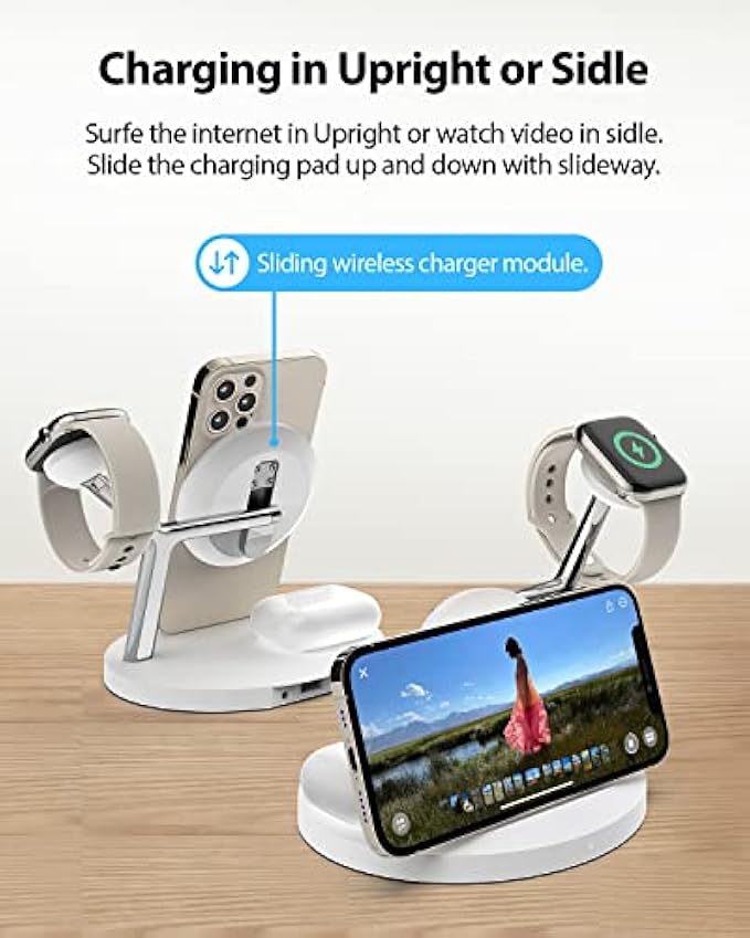 Innovation design for the iFans. You can charge your all Apple devices with this 5-in-1 charging station at the same time now. Three Wireless charging pads make charging easy and keep your desk clean. (The charging pad for the phone is not magnetic and without MagSafe) Extra USB-A & USB-C outputs can power your other devices with charging cables.