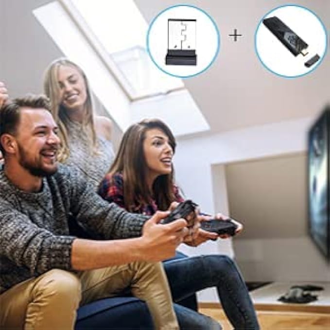【Built-in 10000+ Retro Games】This wireless TV game console built in 10000+ rich games, bringing you back to Childhood Memories instantly . These games are challenging, engaging and fun. is pre-install 9 emulators, and pack with 64GB TF card. No need to download and install by yourself, no internet required, you can play 10000+ classic games just by connecting to the TV.